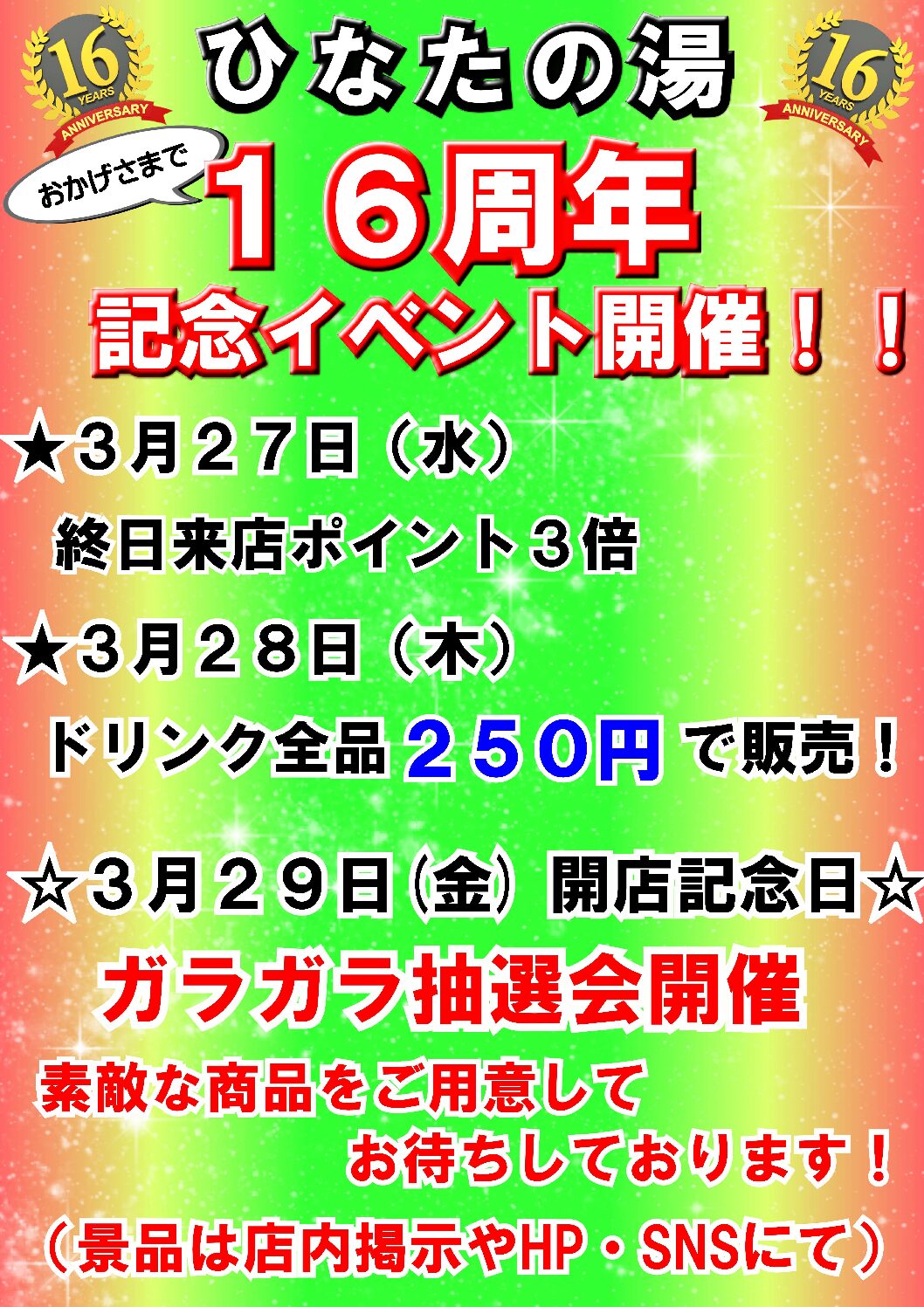 【3月27~29日】ひなたの湯16周年記念イベントを開催!