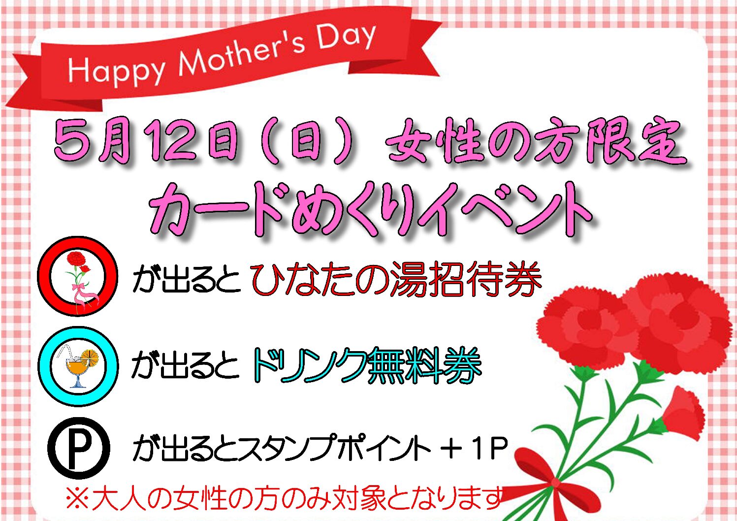 カーネーションの絵柄が出ると入浴ご招待券、ドリンクの絵が出るとワンドリンク券プレゼント!
