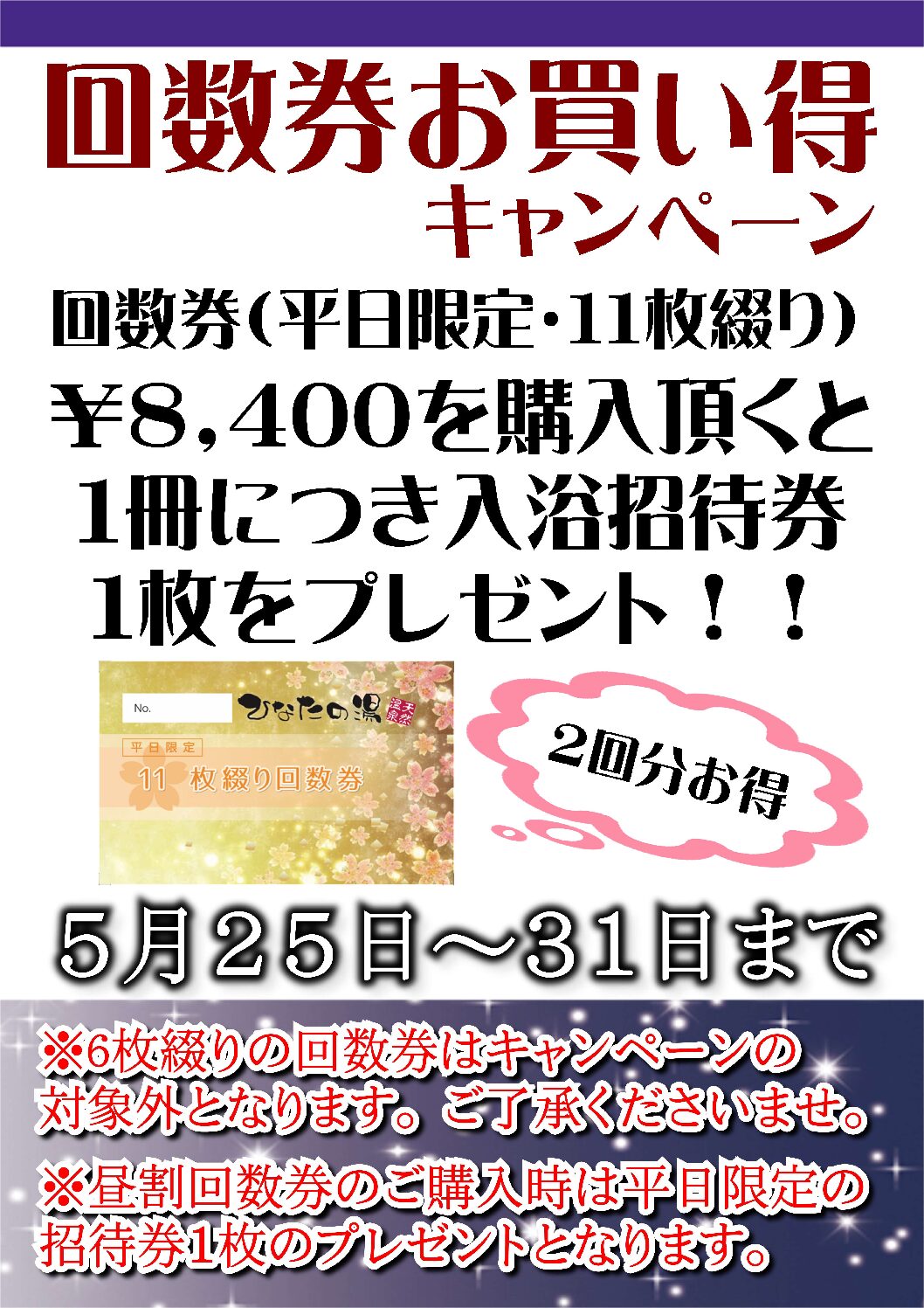 期間中、入浴回数券(平日限定・11枚綴り)のお買い上げ1冊毎に当店の入浴招待券を1枚プレゼント♪