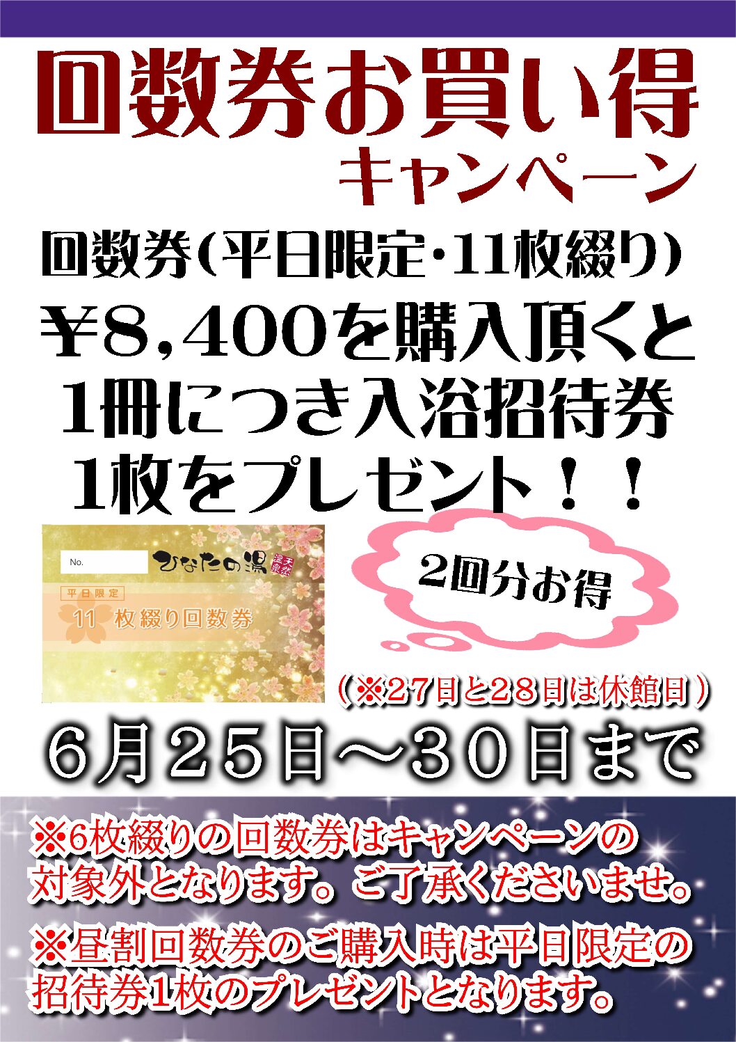 期間中、入浴回数券(平日限定・11枚綴り)のお買い上げ1冊毎に当店の入浴招待券を1枚プレゼント♪