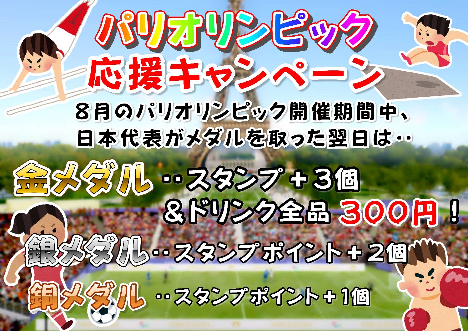 2024.08.01 イベント パリオリンピック応援キャンペーン! 当店ではパリオリンピックの応援キャンペーンを実施中! 日本代表選手が見事メダルを獲得した翌営業日は 獲得したメダルによって特典が変わります! 金・・スタンプポイント+3つ&ドリンク全品300円 銀・・スタンプポイント+2つ 銅・・スタンプポイント+1つ ※ドリンク全品は美酢ソーダ(200円)と ウーロン茶(290円)は対象外となります ※メダルを複数獲得した場合は 1番良い方のみ適用させて頂きます。 シェアする ツイートする LINEで送る 前へ 一覧に戻る 次へ