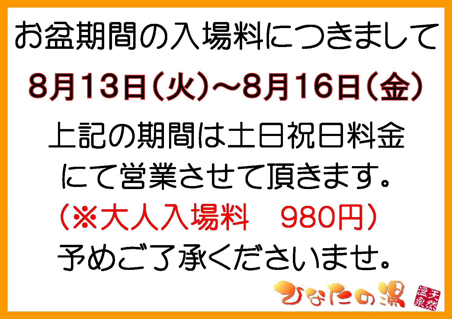 2024.08.09 お知らせ 【8月13日~16日】特別料金のお知らせ 8月13日から16日までの4日間は平日ですが、 お盆の特別料金実施日とさせて頂きます。 (※大人入場料980円) 誠に申し訳ございませんが、何卒ご理解くださいますよう 宜しくお願い申し上げます。 シェアする ツイートする LINEで送る 前へ 一覧に戻る 次へ