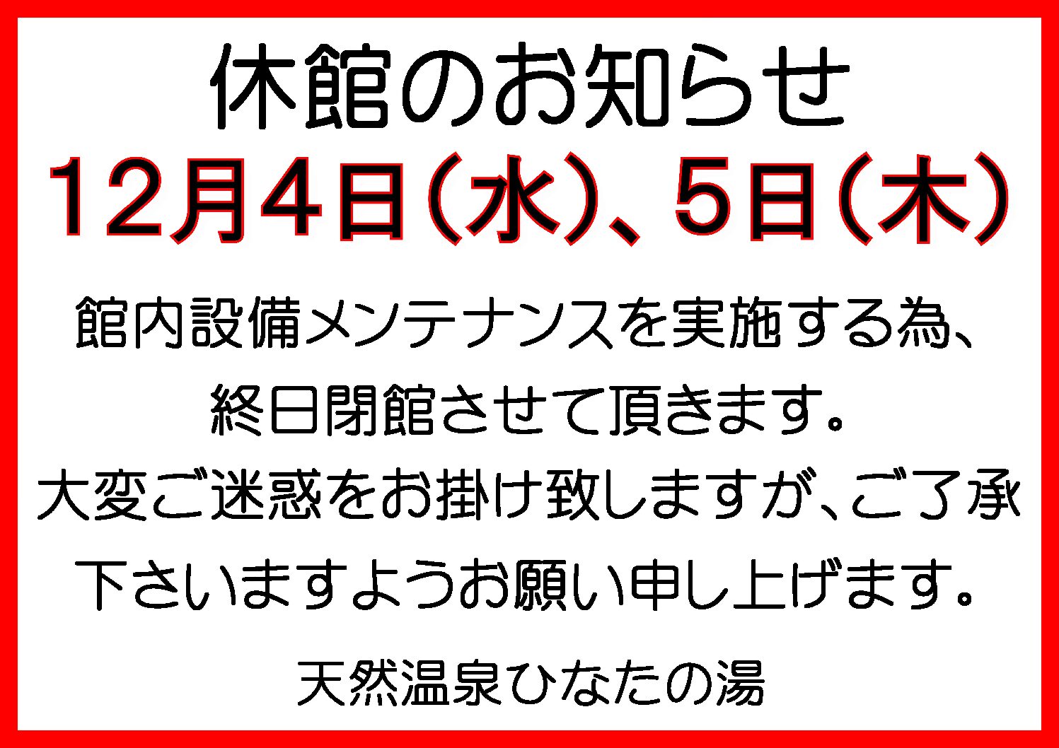 2024.11.09 お知らせ 【12月4日・5日】メンテナンス休館のお知らせ いつもひなたの湯をご利用頂き、ありがとうございます。 休館日のご案内を申し上げます。 12月4日(木)と5日(金)の2日間は 館内設備メンテナンス実施の為、終日休館させて頂きます。 大変ご迷惑をお掛け致しますが、 何卒ご理解賜りますよう、宜しくお願い申し上げます。 シェアする ツイートする LINEで送る 前へ 一覧に戻る 次へ