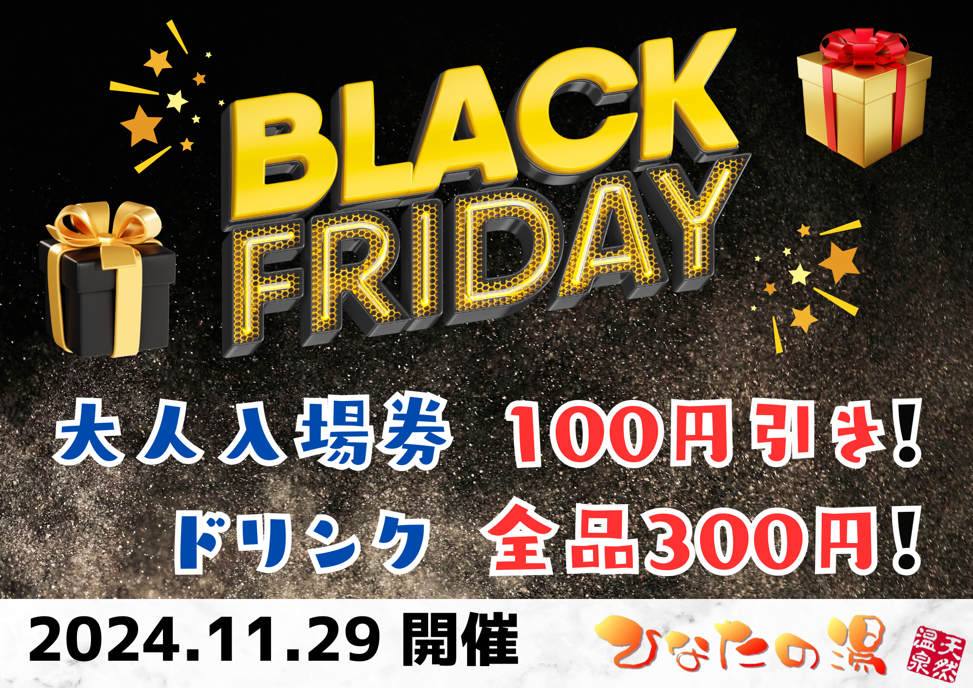 2024.11.23 イベント 【11月29日】ブラックフライデー 11月29日(金)はブラックフライデー!! ◎大人入場券880円 → 780円 (100円引き) ◎ドリンク全品300円 お得な一日となっていますので、ぜひこの機会にご利用ください! 出張や旅行などで新大阪にお立ち寄りの際はぜひ当店の天然温泉へ! ひなたの湯は早朝より営業中! 朝風呂のご利用でもどうぞ♪ サウナ、ととのい、露天風呂の外気浴でもぜひ当店へ! 皆様のお越しをお待ちしております! シェアする ツイートする LINEで送る 前へ 一覧に戻る 次へ