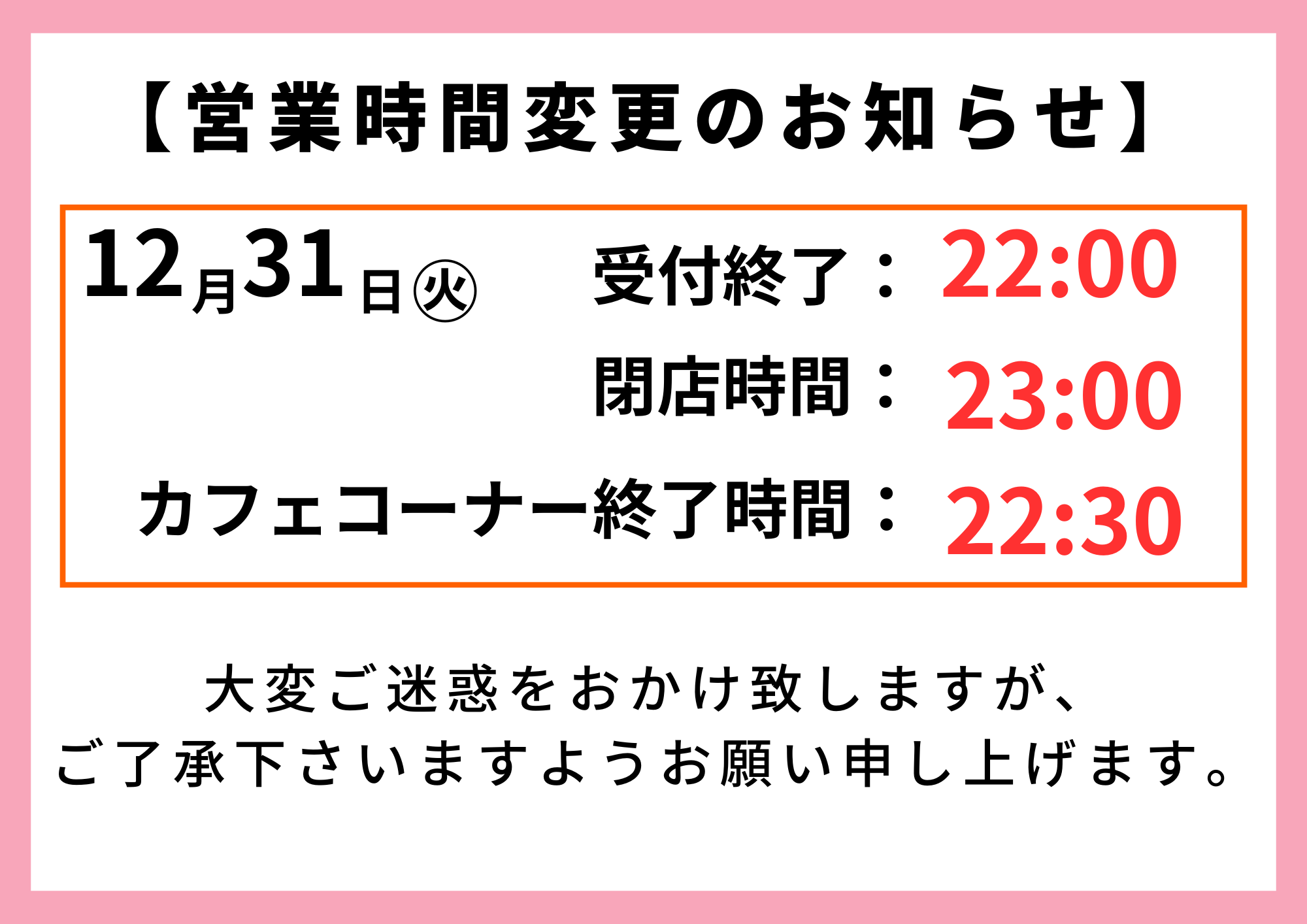 2024.12.30 お知らせ 12月31日の営業時間変更につきまして いつもご愛顧頂き、誠にありがとうございます。 12月31日の営業時間変更につきまして 下記の通り、ご案内致します。 受付終了時間:22:00 閉店時間:23:00 カフェコーナーオーダーストップ:22:30 ご迷惑をお掛けして誠に申し訳ございませんが、 何卒ご了承の程、宜しくお願い致します。 シェアする ツイートする LINEで送る 前へ 一覧に戻る 次へ