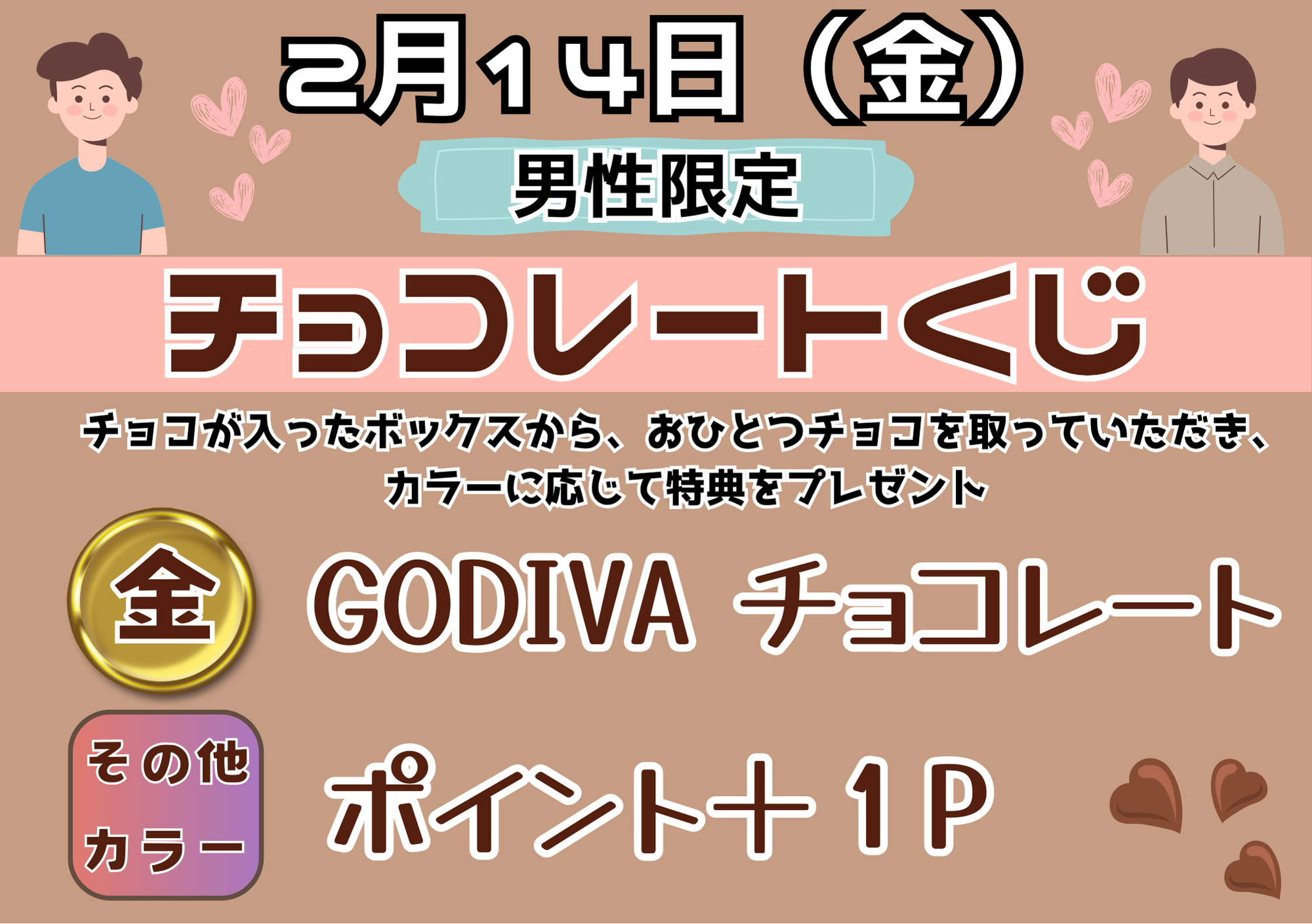 男性のお客様限定でご入場受付時にチョコが入ったボックスから、おひとつチョコを取っていただき、包み紙のカラーに応じて特典をプレゼント!