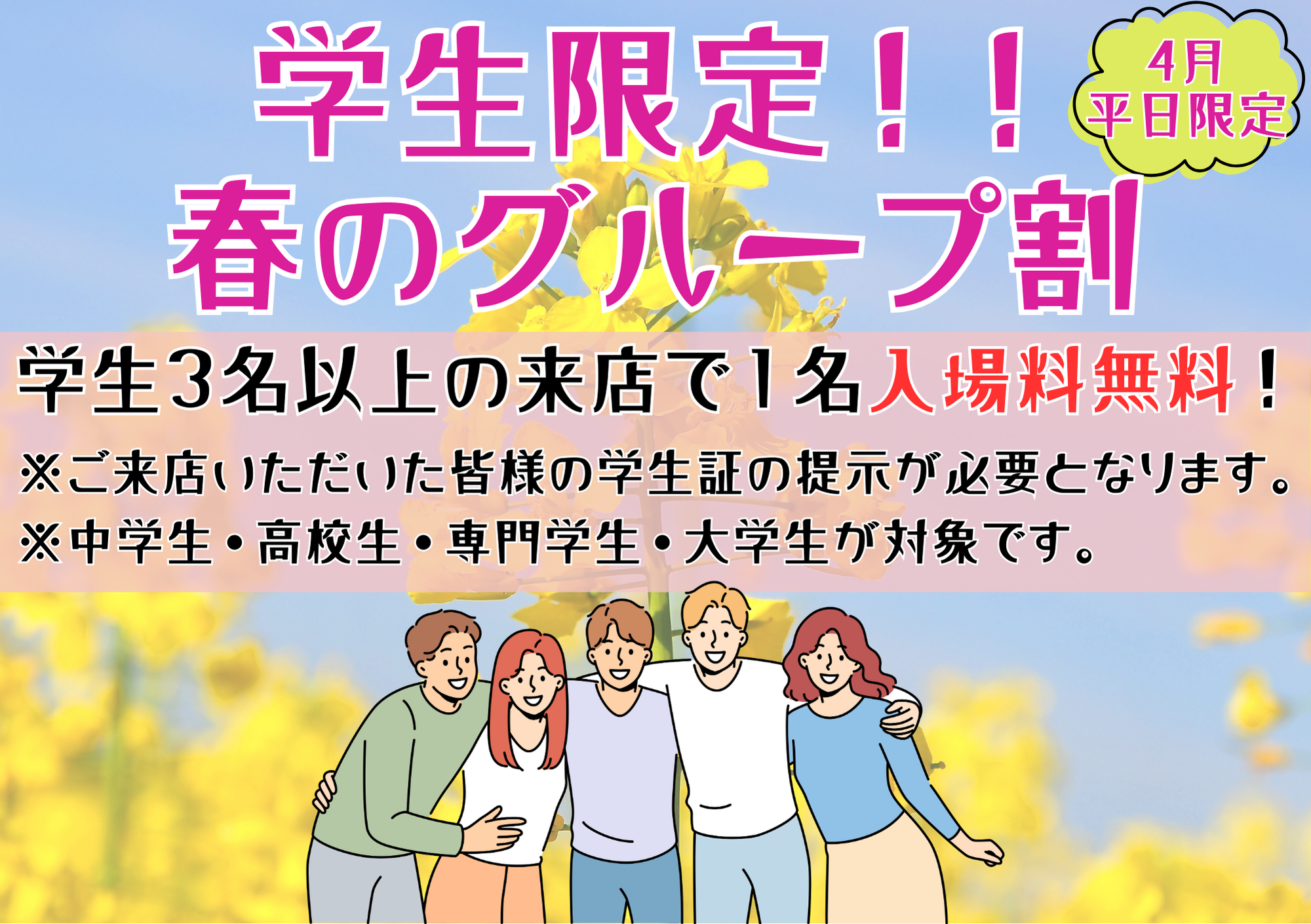 学生3名様以上の来店で1名様入場料無料のお得なキャンペーンを実施中です!