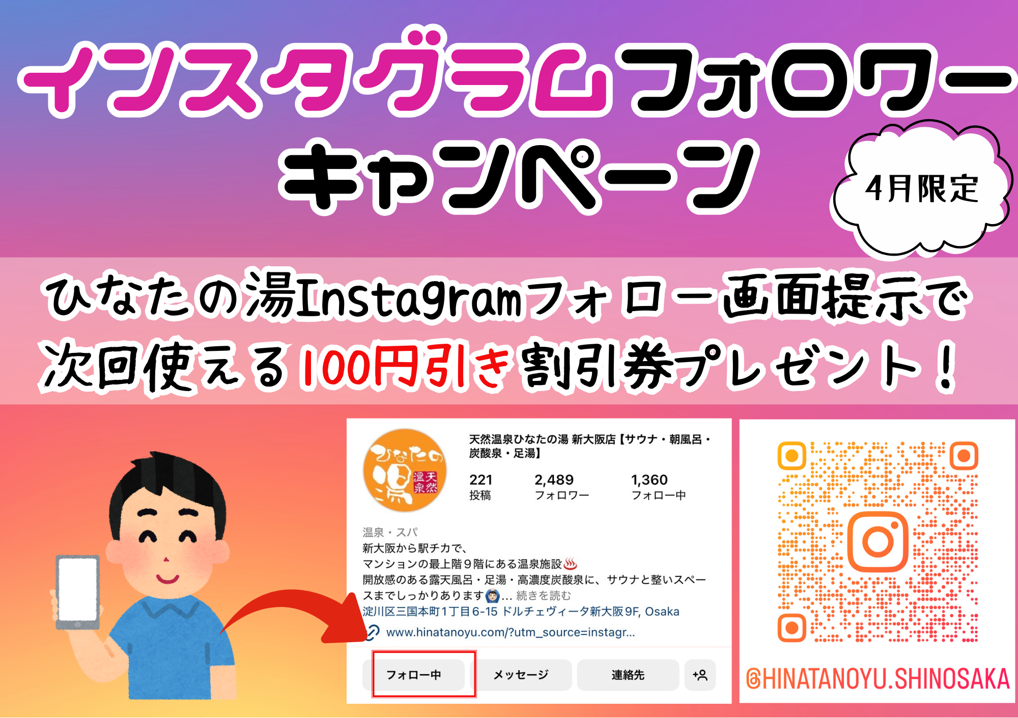 ひなたの湯公式インスタグラムのフォロー画面提示で