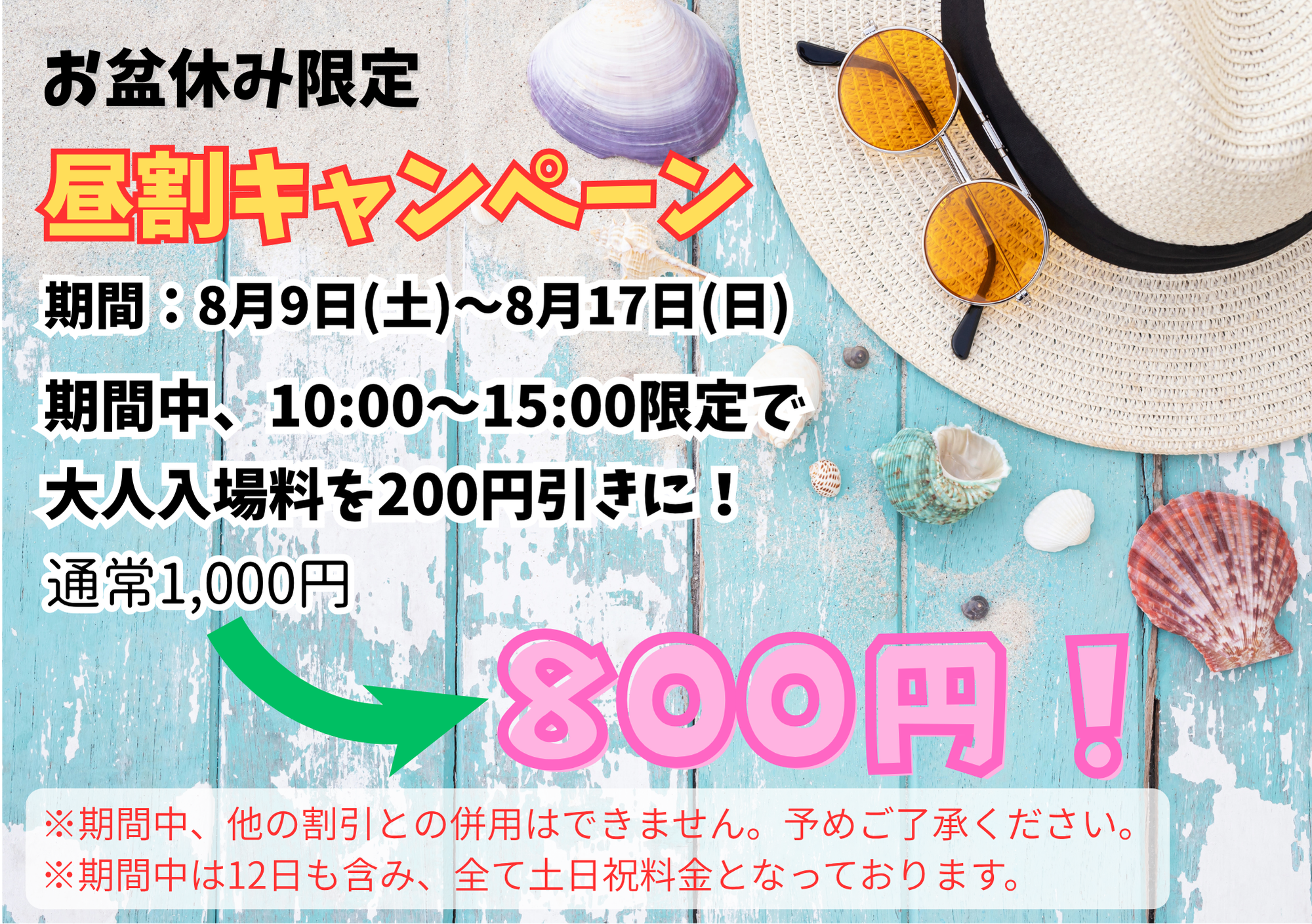 ※8月12日~8月15日はお盆特別料金として大人入場料が1000円となります。