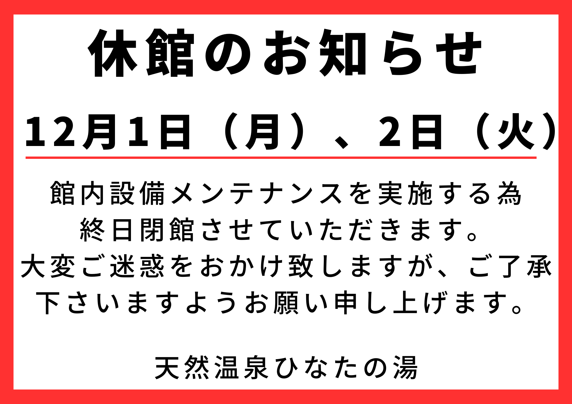 2025.11.01 お知らせ 【12月1日・2日】休館日のお知らせ 平素より当店をご愛顧いただき、誠にありがとうございます。 12月に予定しております設備メンテナンスの為の 休館日についてご案内させていただきます。 休館日日時:12月1日・2日 終日 (12月3日 6:00より通常営業を再開いたします。) 大変ご迷惑をおかけしますが何卒ご理解の程、宜しくお願い申し上げます。 天然温泉ひなたの湯 シェアする ツイートする LINEで送る 前へ 一覧に戻る 次へ